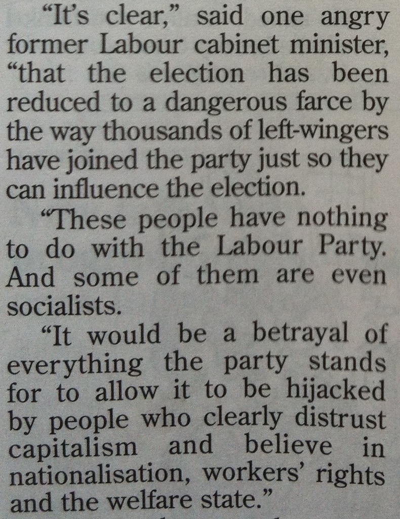Mainstream Labour politicians express astonishment that Jeremy Corbyn’s campaign for Labour leadership is gaining so much support. Tony Blair, Jack Straw and others have expressed apocalyptic fears of the effect on a Corbyn leadership on the electability of the party. His popularity, some say, must be the result of infiltration. Private Eye have an amusing take on this: