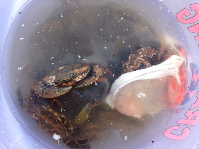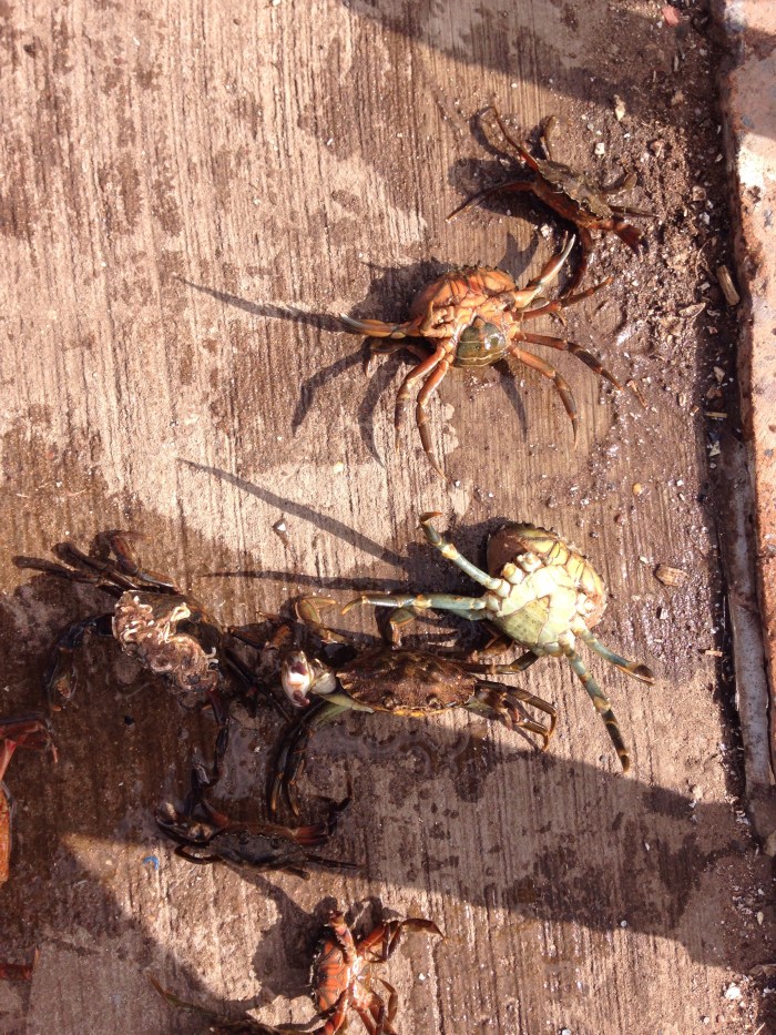 I say: Shouldn’t we put the crabs back in the water? There are so many crammed together in the bucket.